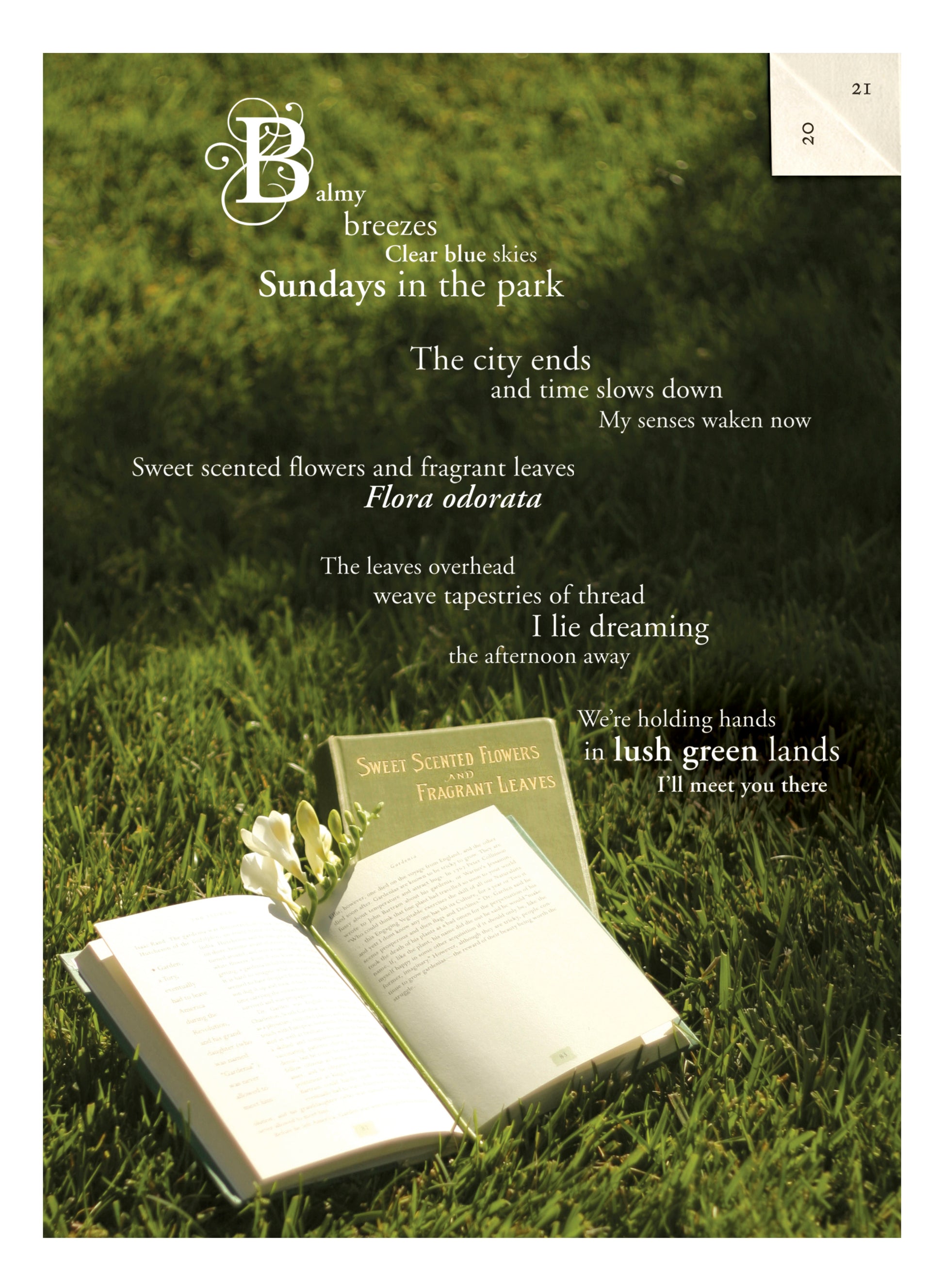 Balmy Days & Sundays is a perfume about perfect moments on a relaxing Sunday, lying in the grass, breathing the smells of sweet scented flowers and fragrant leaves. Let your senses be awakened by this elixir of fresh botanical scents. Green notes of foliage and grass are entwined with the sweet scent of yellow freesia, honeysuckle and rose. Forecast: Balmy weather and whispering soft-scented breezes.