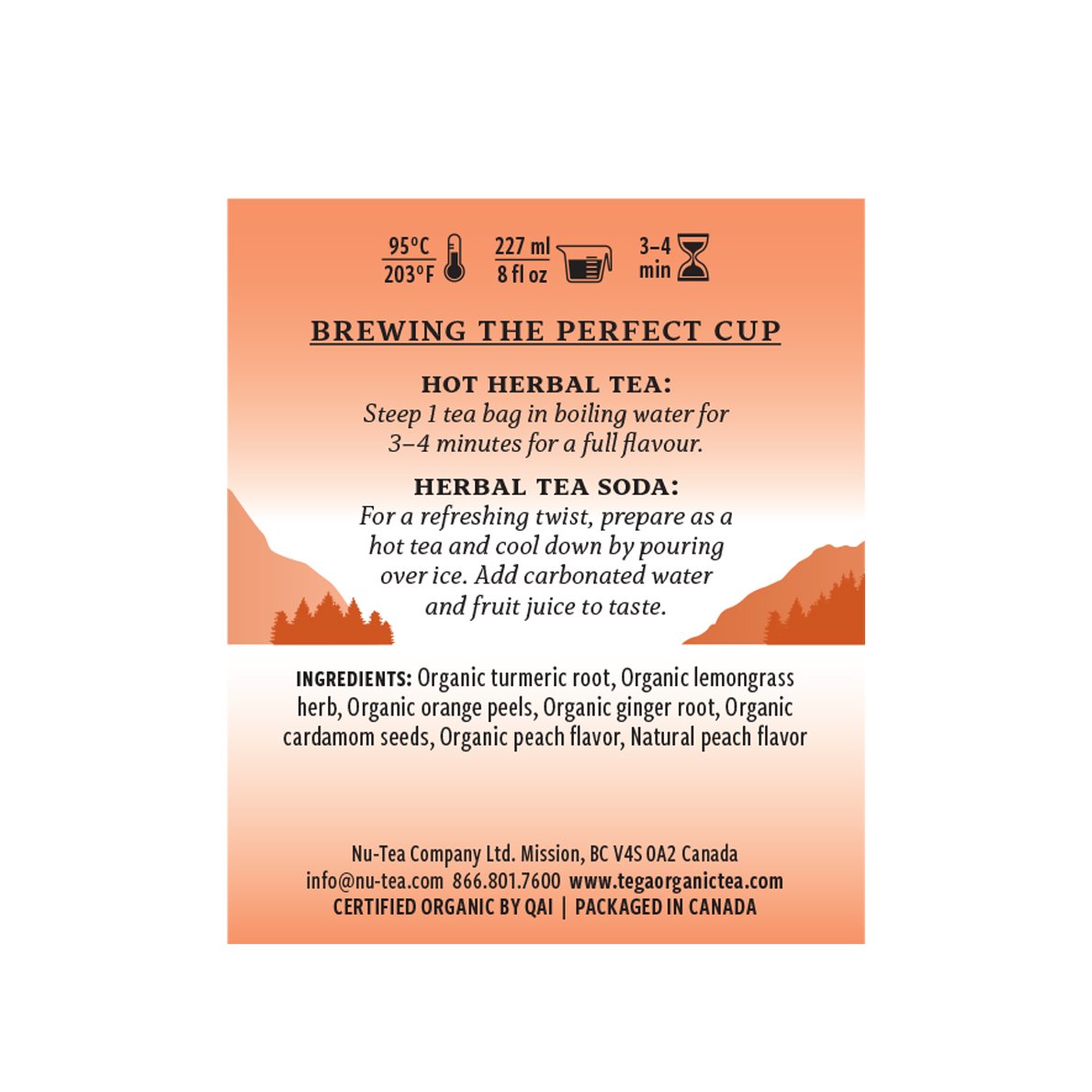 Indulge in the perfect blend of warmth and vitality with Tega Peach Turmeric Herbal Tea. This golden herbal infusion, featuring organic turmeric root, lemongrass, sweet orange peels, ginger root, cardamom seeds, and organic natural peach flavor, offers a delightful taste experience that is both soothing and uplifting.